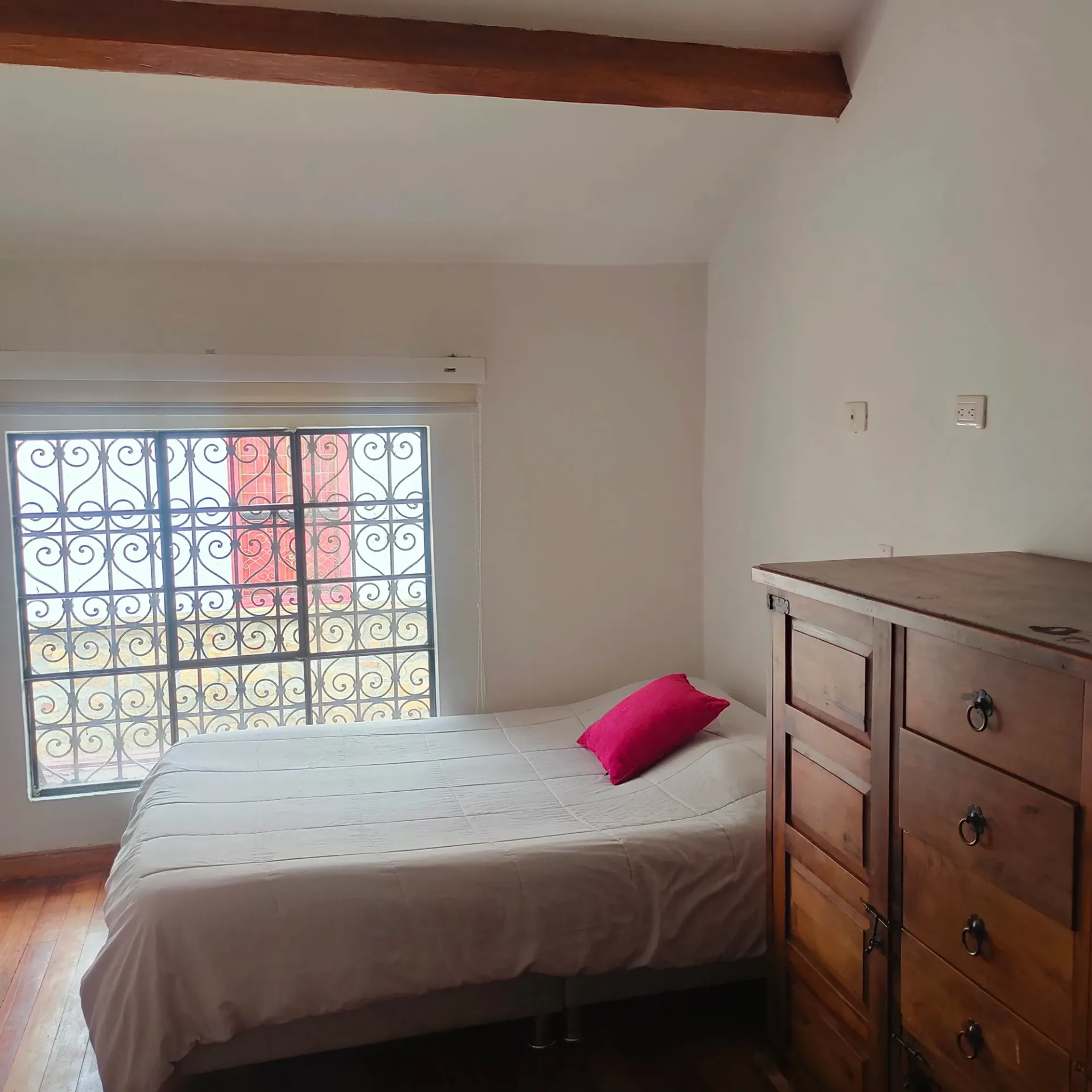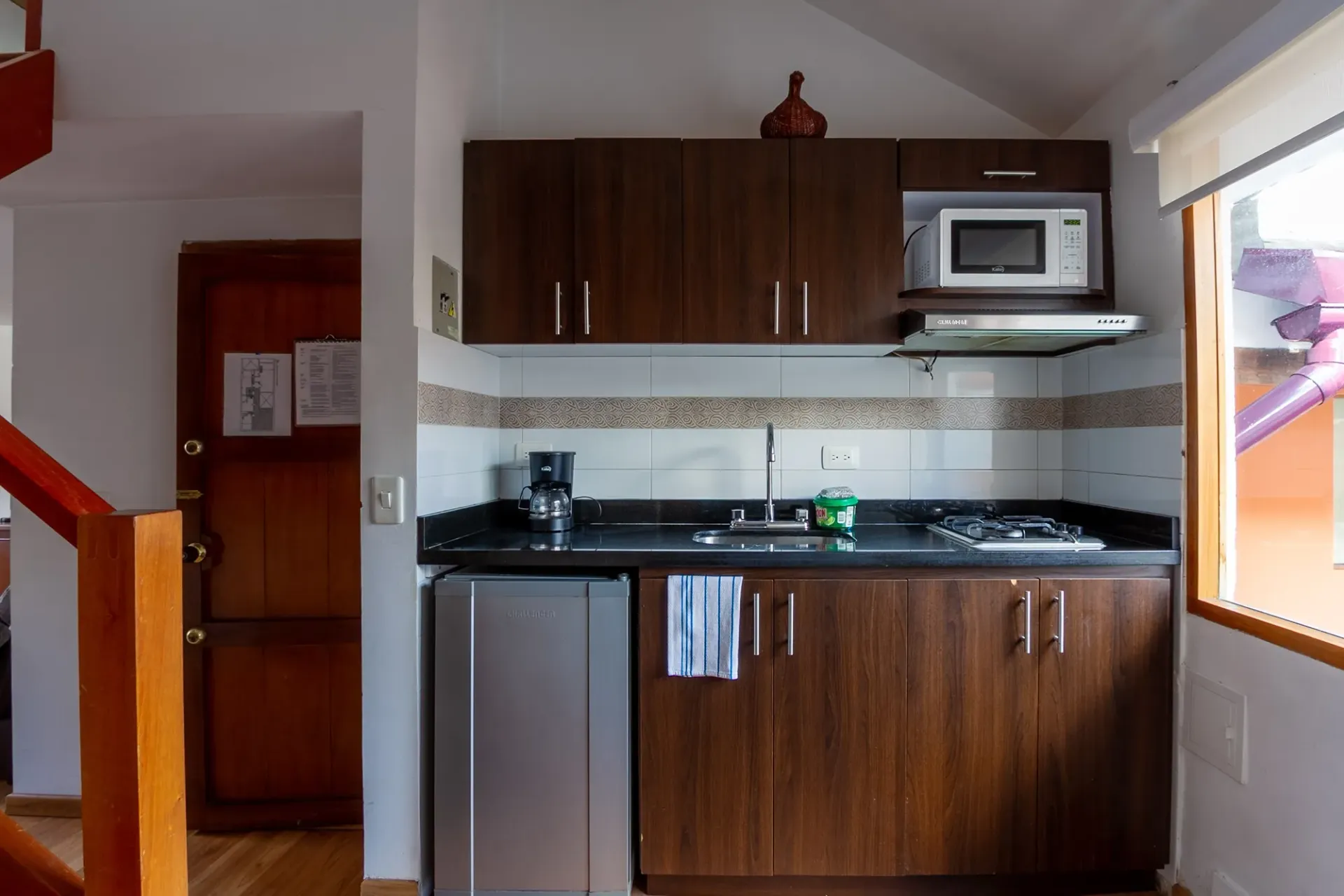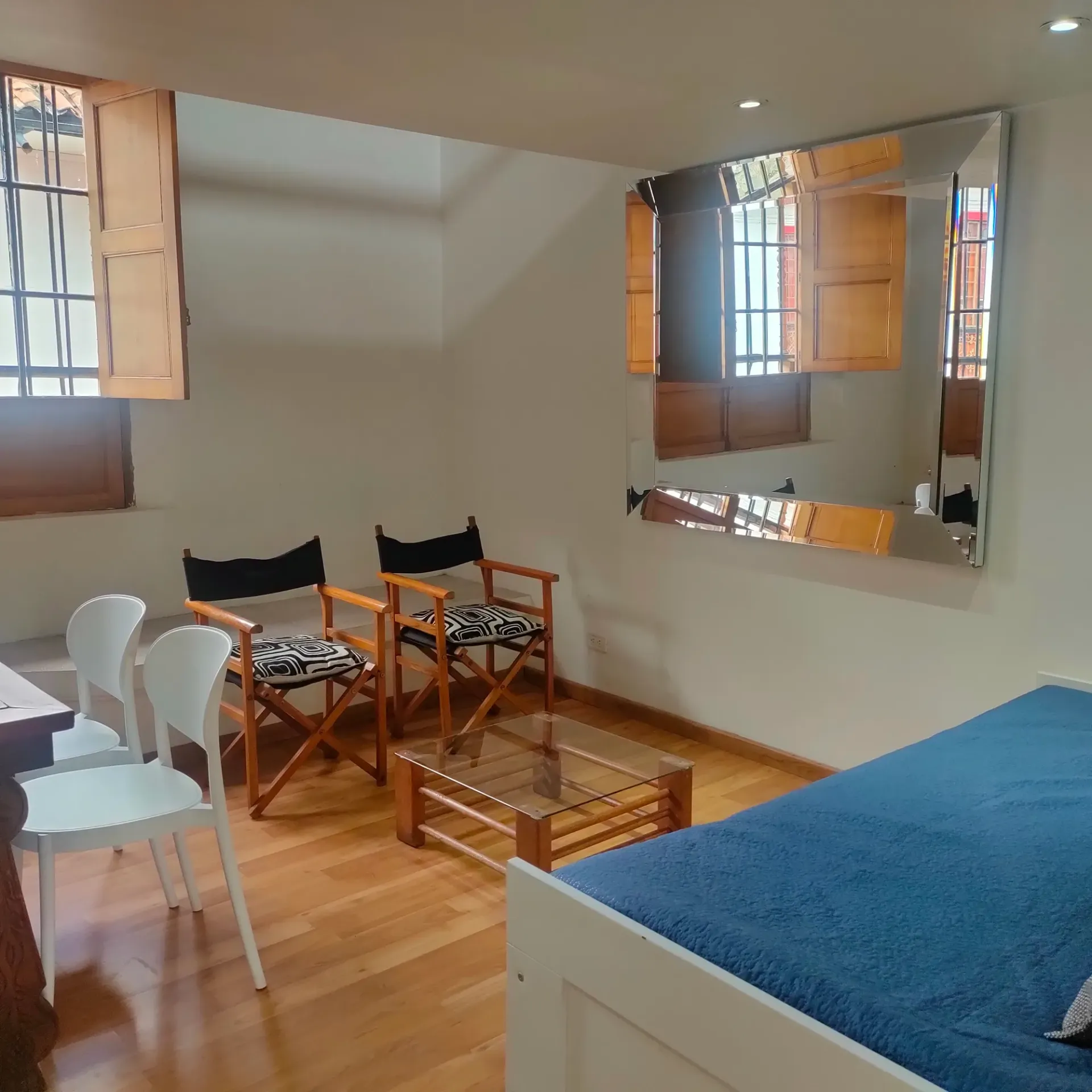 Apartaestudio amoblado de dos plantas, a partir de 45 metros cuadrados, 2 alcobas, 2 baños uno con tina, sala-comedor, escritorio y cocina con menaje incluido y chimenea a gas.
